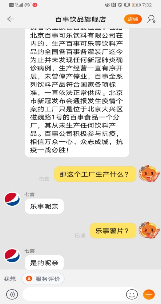 此外,记者就此事询问百事饮品旗舰店,淘宝客服也回应称该工厂生产“乐事”。