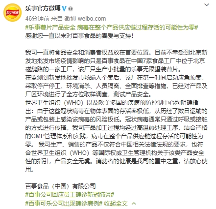 乐事官方微博发文称,目前不幸受到北京新发地批发市场疫情影响的只是百事食品在中国7家食品工厂中位于北京磁魏路的一家工厂,该厂只生产小批量的乐事无限罐装薯片。