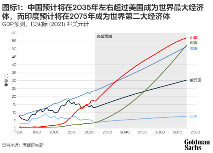 高盛研究部认为,全世界经济增长最快的时期已经一去不复返。随着人口增长减弱,经济扩张也逐渐放缓。部分亚洲新兴经济体预计将继续追赶并超越发达国家,未来30年全球GDP的重心将更多地向亚洲转移。其中,最大的变化包括中国或将在2035年超越美国,成为世界第一大经济体;印度也可能将在2075年继续超越美国,跃居世界第二。