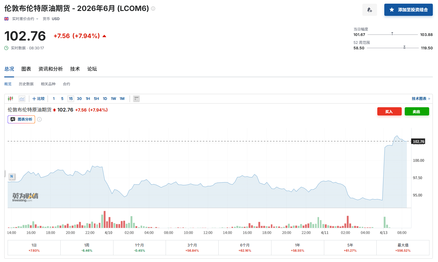随着美国与伊朗周末的和谈“无果而终”、双方紧张氛围再度拉满,国际油价周一亚洲开盘大涨:布伦特原油期货和WTI原油期货涨均上涨约8%。