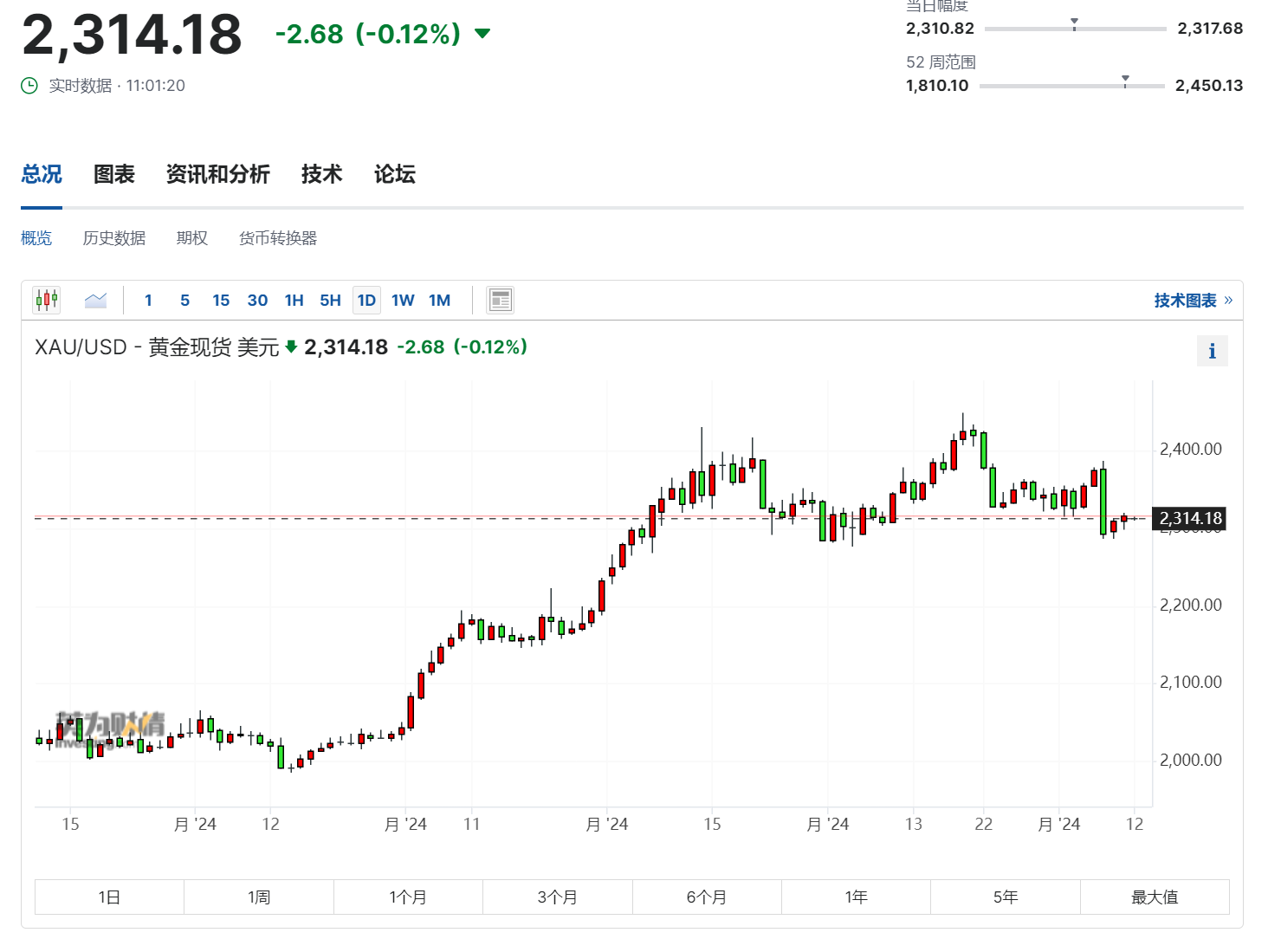 截至发稿,现货黄金的交易价格略高于每盎司2,300美元,年初至今上涨了约12%,仅比上月创下的纪录高点低6%左右。