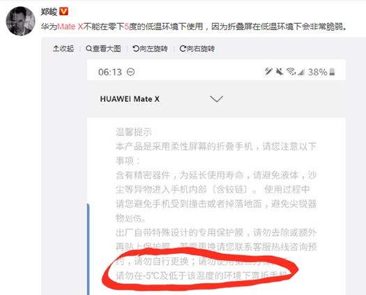 “华为Mate X还不那么成熟,零下5度不能弯折。零下5度不算一个很低的温度,湖北以北、四川以西,基本上很多地方冬天都能达到-5度数,应该说华为Mate X技术还不太成熟,为了抢夺市场而急于推出确实有点仓促。那么问题来了,如果坏了给保修吗?”
