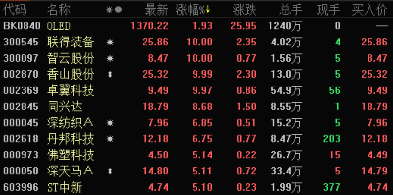 受此利好影响,今日早盘柔性屏概念股全面走强,香山股份、智云股份、国风塑业、联得装备纷纷高开后直线秒涨停,其中龙头股香山股份已连续3涨停。深天马A、同兴达、春兴精工、智动力等涨幅居前。