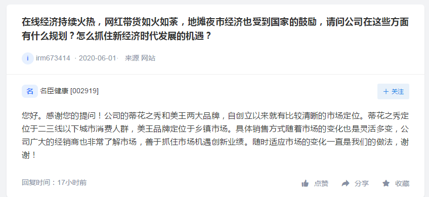 政策的持续加持,令地摊经济俨然成为衡量股价涨跌的标准之一。昨日盘后有投资者在互动平台上询问名臣健康,在线经济持续火热,网红带货如火如荼,地摊夜市经济也受到国家的鼓励,公司在这些方面有什么规划?怎么抓住新经济时代发展的机遇?