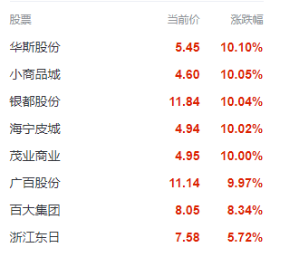 今日早盘,地摊经济概念股继续强势拉升,截至发稿,华斯股份、小商品城、银都股份、海宁皮城、茂业商业等涨停,百大集团、浙江东日、人民同泰等涨幅居前。