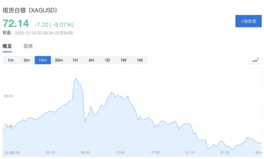 白银现货一度涨超5%,随后直线跳水,一度跌约5%。详情>>