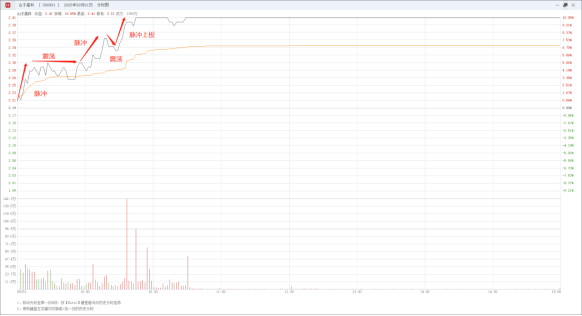 而脉冲过后的回踩一方面尽量是缩量向下二是回落时不要有效跌破均价线,最好是在均价线附近短时间震荡横盘后再快速放量拉升形成第二轮脉冲,形成 “锯齿少、斜率陡” 的阶梯式上板分时曲线,反映场外资金急于入场,场内资金惜售。