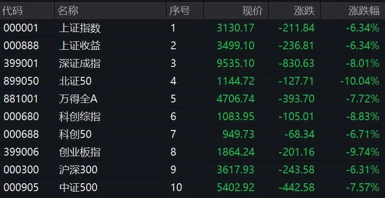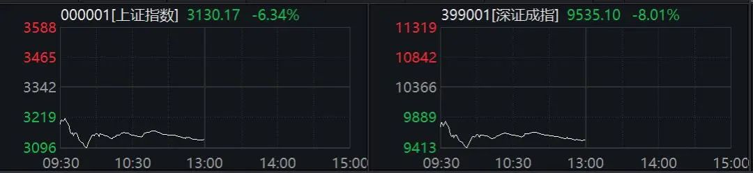 受清明假日期间,外围市场暴跌影响,今日早间A股大幅低开,上证指数盘中一度跌破3100点,创半年多来新低,深证成指亦一度重挫逾9%,创年内新低。超5200只个股下跌,成交量呈快速放大趋势,半日成交超万亿元。