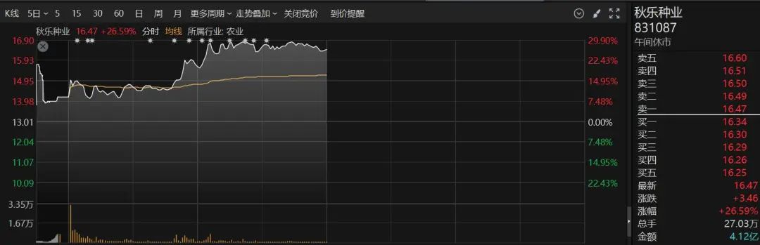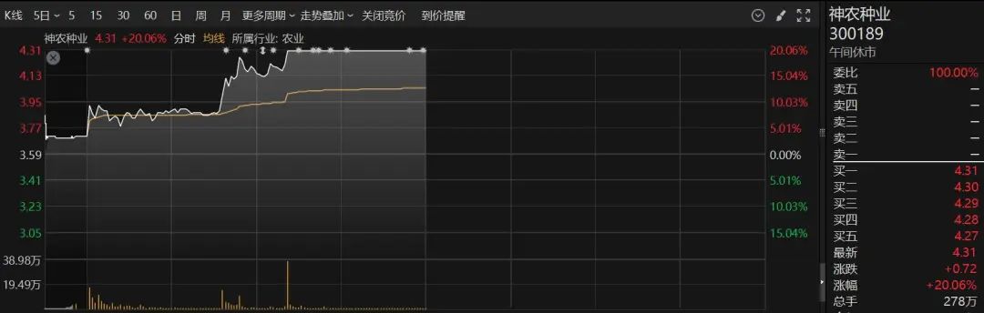 板块内所有个股大涨,秋乐种业一度冲击30%涨停,神农种业20%涨停,敦煌种业、万向德农等涨停或涨超10%。