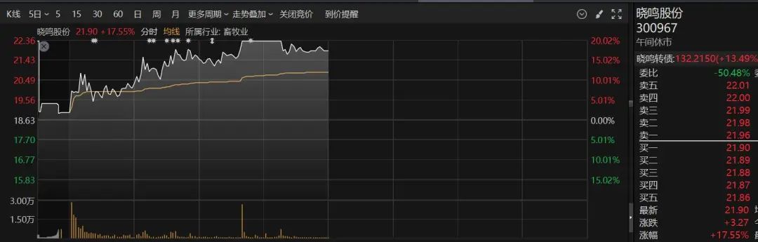 鸡肉概念则低开高走,板块指数盘中大涨逾3%,创年内新高,不到1小时成交超过前一交易日全天成交。晓鸣股份盘中拉升,一度触及20%涨停,创近3年新高,湘佳股份亦强势封板,创1年多新高,益客食品、立华股份等涨幅居前。