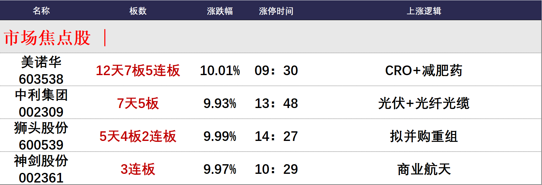 板块方面,光纤概念股持续走强,中利集团7天5板,杭电股份4天3板,长飞光纤5天3板,法尔胜、长江通信2连板;商业航天概念股近期反复活跃,神剑股份3连板,再升科技4天3板,江顺科技4天2板,广联航空20CM涨停,消息面上,星河动力董事长表示,星河动力的发射订单已排至2028年,任务储备饱满。