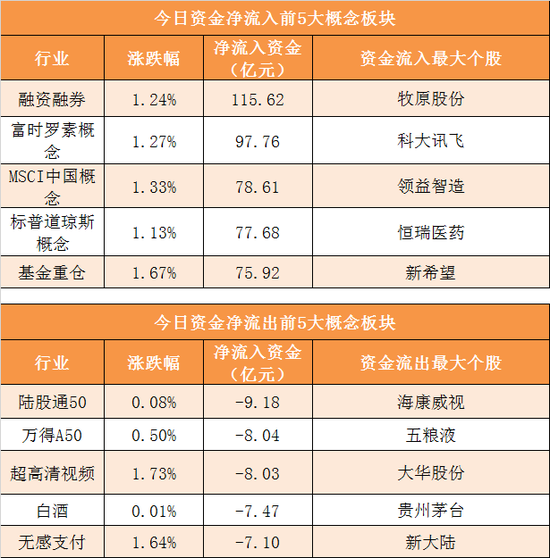 概念板块方面,今日融资融券、富时罗素概念、MSCI中国概念、标普道琼斯概念等概念板块资金呈现净流入,其中融资融券概念净流入115.62亿元居首。