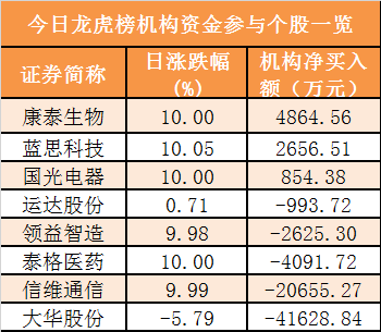 盘后龙虎榜数据显示,机构现身8股,其中康泰生物(79.060, 7.19,10.00%)等3股呈现机构资金净买入,大华股份(16.270, -1.00, -5.79%)等5股呈现机构资金净卖出。