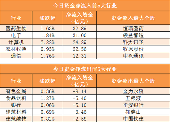 3、医药生物行业净流入32.89亿元居首
