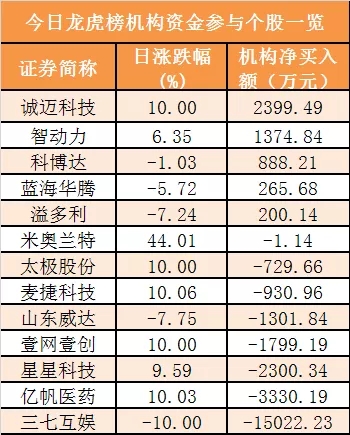 盘后龙虎榜数据显示,机构现身13股,其中诚迈科技等5股呈现机构资金净买入,三七互娱等8股呈现机构资金净卖出。