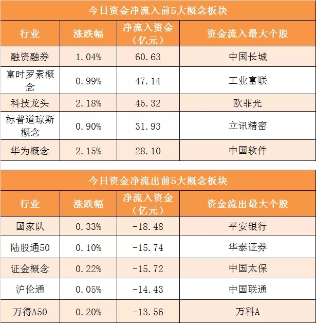 概念板块方面,今日融资融券、富时罗素概念、科技龙头、标普道琼斯概念等概念板块资金呈现净流入,其中融资融券概念净流入60.63亿元居首。