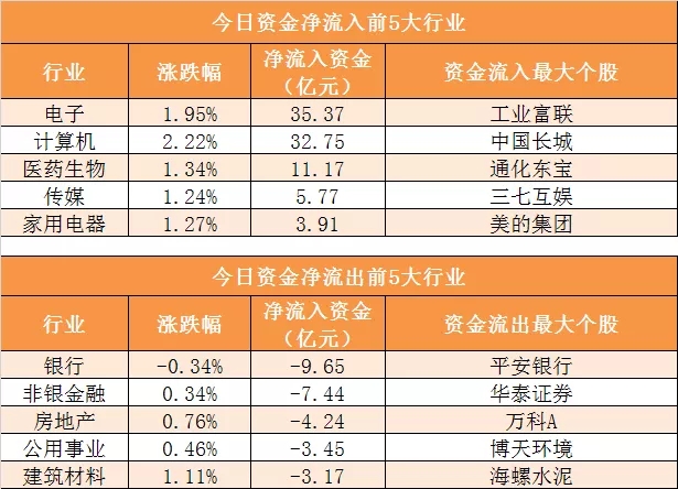 28个申万一级行业中,15个行业实现资金净流入,其中电子行业净流入35.37亿元居首。