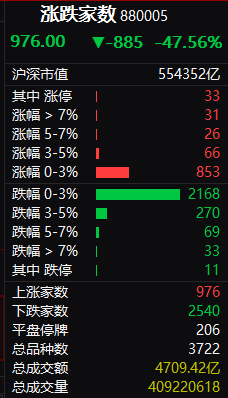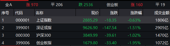 当天下午,市场并未出现明显止跌,有一段时间,市场跌幅还在扩大。当日收盘的情况大概是这样的:市场涨少跌多,指数全线收绿。