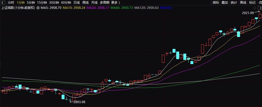 11月22日早盘的市场大概是这样的:以下是上证指数的1分钟分时K线。