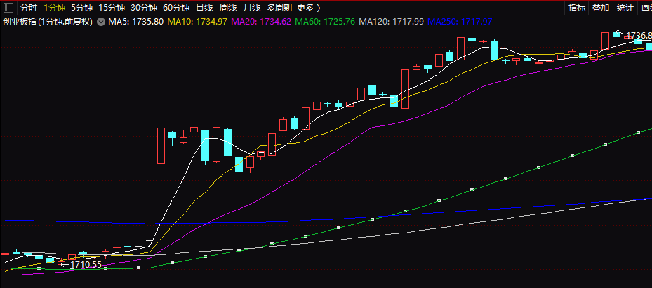以下是创业板的1分钟K线。当日,创业板还是跳空高开。