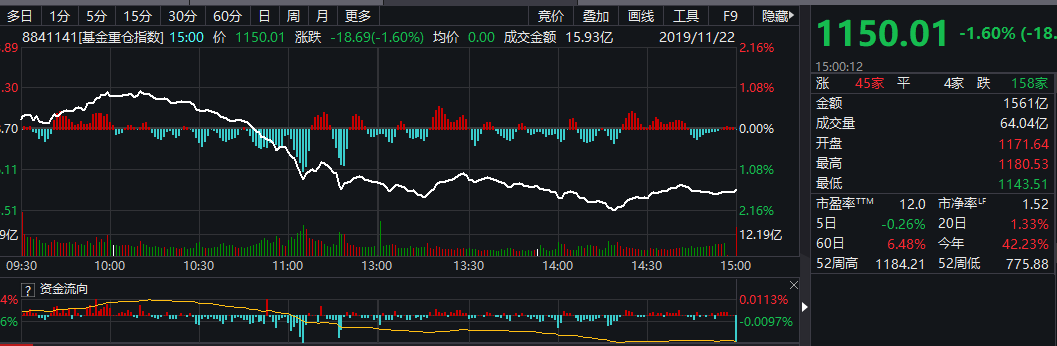 首先来看一下基金重仓指数的表现。该指数22日杀跌1.6%,而上证指数仅下跌0.63%,中证500也仅下跌0.84%。