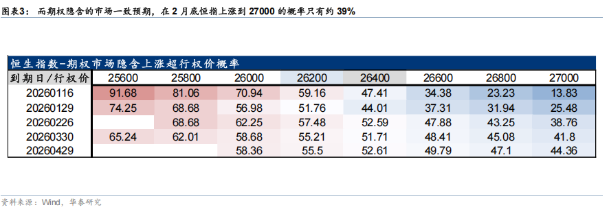 该券商还还指出,当前市场隐含的恒指在1月底、2月底上涨到27000点的概率仅为25%和39%,存在明显的正向预期差。这一情绪低点与A股市场形成鲜明对比,AH溢价指数已上升至122.7的阶段高点,显示港股相对A股处于明显低估状态。