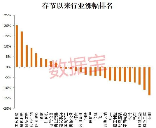 证券时报·数据宝统计显示,春节以来农林牧渔、食品饮料行业指数涨幅名列前茅。农林牧渔行业表现最为抢眼,累计涨幅达到20.1%。农林牧渔行业公司中,金健米业、新希望、北大荒、牧原股份、苏垦农发等粮食及猪肉股涨幅居前。
