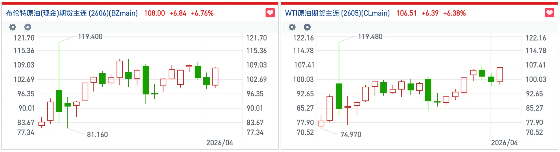 而随着特朗普冲突言论的升级,亚洲交易时段,国际原油期货随即跳涨。布伦特原油期货主力合约日内一度扩大涨幅至近7%。截至发稿,布伦特原油及WTI原油期货主连均涨超6%,站稳105美元/桶。
