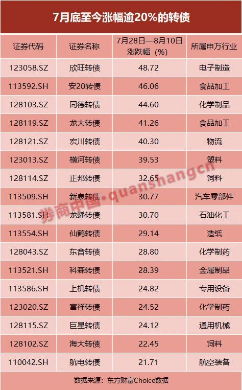 根据东方财富Choice数据统计,在7月28日至今,共有17只转债上涨超过20%,其中5只上涨逾40%。欣旺转债涨幅最高,达到48.72%;安20转债涨46.06%。