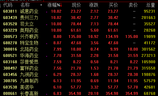 医药板块今日盘中大幅拉升,截至收盘,诚意药业贵州三力司太立奥翔药业等涨停,兴齐眼药特宝生物涨幅超8%。