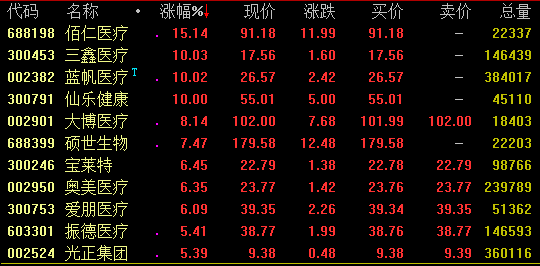 医疗保健板块今日盘中走势活跃,截至收盘,佰仁医疗大涨逾15%,三鑫医疗、蓝矾医疗、仙乐健康等涨停,大博医疗涨逾8%。