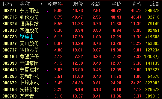 建材板块今日盘中震荡上扬,水泥股表现活跃。截至收盘,祁连山天山股份涨逾6%,宁夏建材上峰水泥万年青等涨幅超3%。此外,主营防水材料的东方雨虹凯伦股份涨近7%。