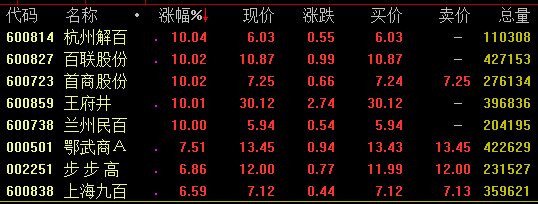 免税概念今日盘中集体发力走高,截至收盘,杭州解百百联股份首商股份王府井兰州民百等涨停,鄂武商A涨7.5%。