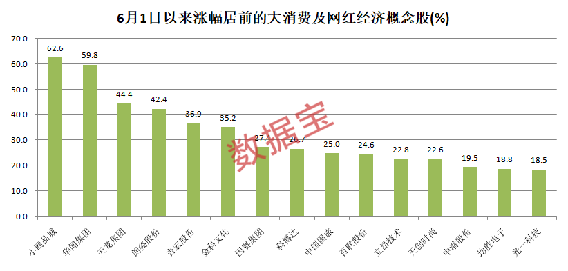 事实上,自购物节启动以来,大消费、网红经济板块160只个股都纷纷沸腾。从二级市场表现来看,6月份以来平均上涨8.18%,大幅跑赢大盘(同期上涨2.78%)。近七成个股跑赢大盘,累计涨幅超过20%的个股有18只。
