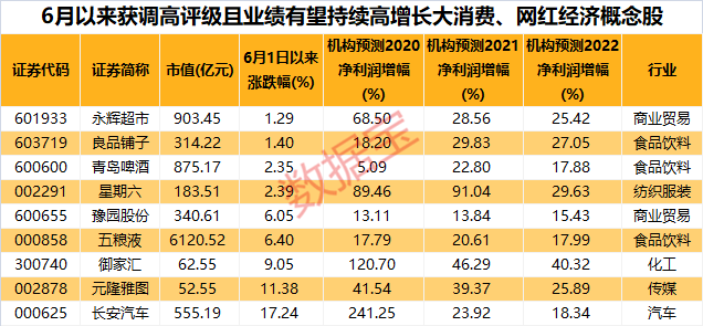 具体来看,御家汇5月末评级为“增持”,最新评级为“增持+”,机构预测其今年净利润有望翻倍,未来2年均有望超过40%;星期六获机构预测今年、明年净利润增幅均有望超85%,2022年增幅或接近30%。永辉超市机构预测其2020年净利润增幅有望接近70%,2021年及2022年净利润增幅均有望超过25%。