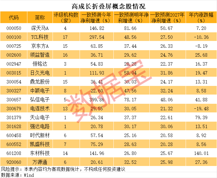 A股市场上折叠屏概念股合计有34只。根据机构一致预测,有16只个股今年、明年及2027年净利增速均超20%。