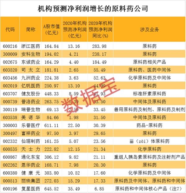 根据5家以上机构一致预测数据,19股今年净利润有望实现同比增长,浙江医药、安科生物、东诚药业等3股获机构预测净利润有望翻倍增长。浙江医药净利润预测增幅最高,机构一致预测其今年净利润为13.16亿元,同比增长283.98%。浙江医药医药制造类业务涵盖了化学原料药及其制剂产品、保健品等细分行业,其中化学原料药主要包括抗耐药抗生素原料药和抗疟疾药。