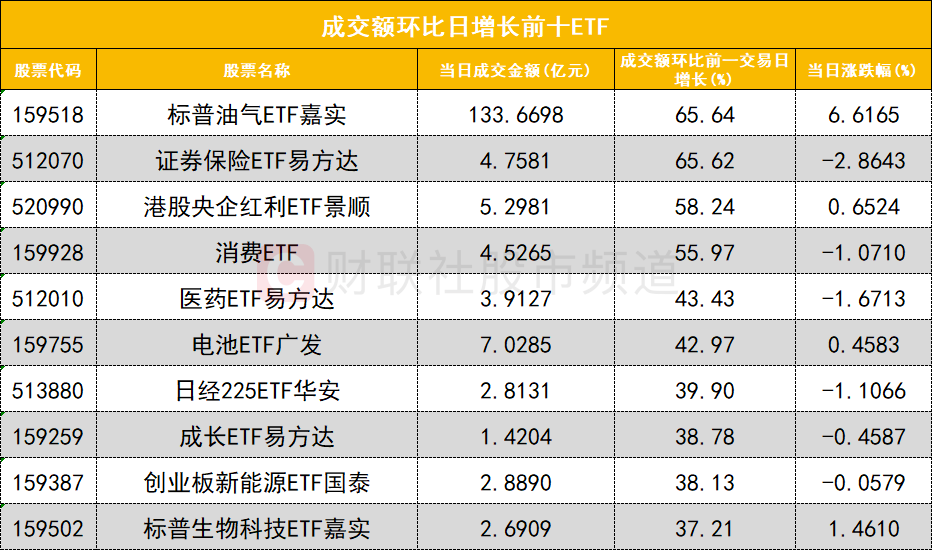 从成交额环比增长前十的ETF来看,标普油气ETF嘉实(159518)成交额环比增长65%位居首位;证券保险ETF易方达(512070)成交额环比增长65%位居次席。