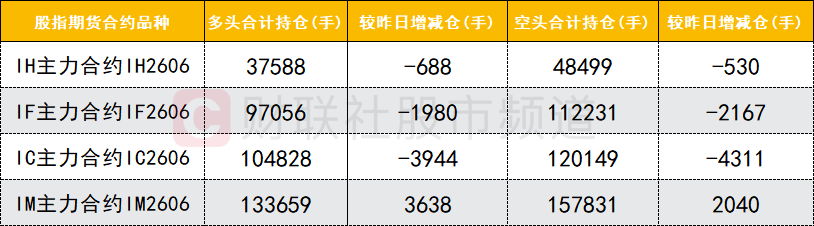 四大期指主力合约中,IH、IF、IC合约多空双方均减仓,IC合约空头减仓数量较多。IM合约多空双方均加仓,多头加仓数量较多。