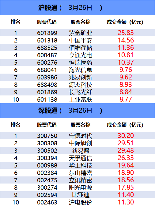 从沪股通前十大成交个股来看,紫金矿业位居首位;中国平安和佰维存储分居二、三位。