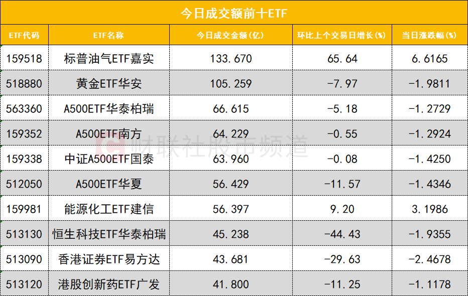 从成交额前十的ETF来看,标普油气ETF嘉实(159518)成交额位居首位,黄金ETF华安(518880)成交额位居次席。