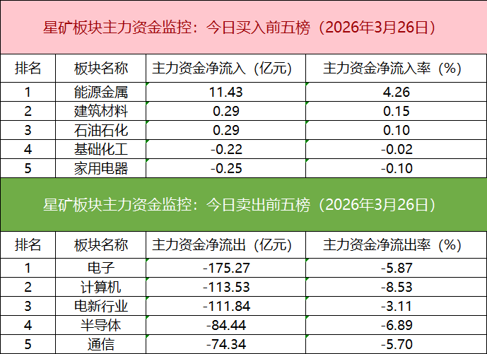 板块资金流出方面,电子板块主力资金净流出居首。