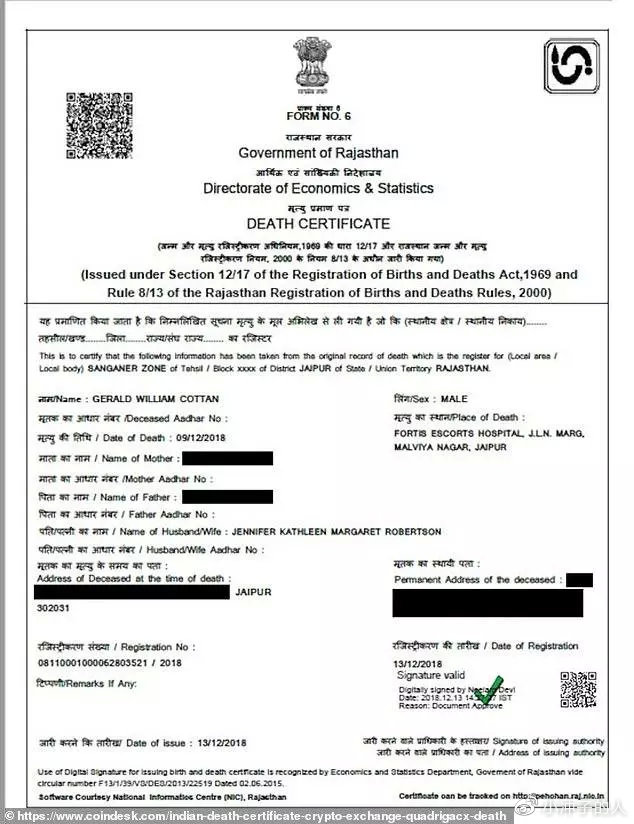 杰拉尔德在印度死后,印度拉贾斯坦邦医院出具了一份他的死亡证明。但在这份死亡证明上他的名字居然被拼错了,外媒表示,在那个国家伪造一个死亡证明并非难事。另外,在他与妻子前往印度旅行之前,他的数字钱包就空了。杰拉尔德有一些存储了7.5万名客户加密货币的硬盘,但只有他有密码。密码是一长串几乎不可能记住的随机数字和字母,被锁在他阁楼的保险柜里。今年3月,安永会计师事务所发现那些数字钱包不见了。