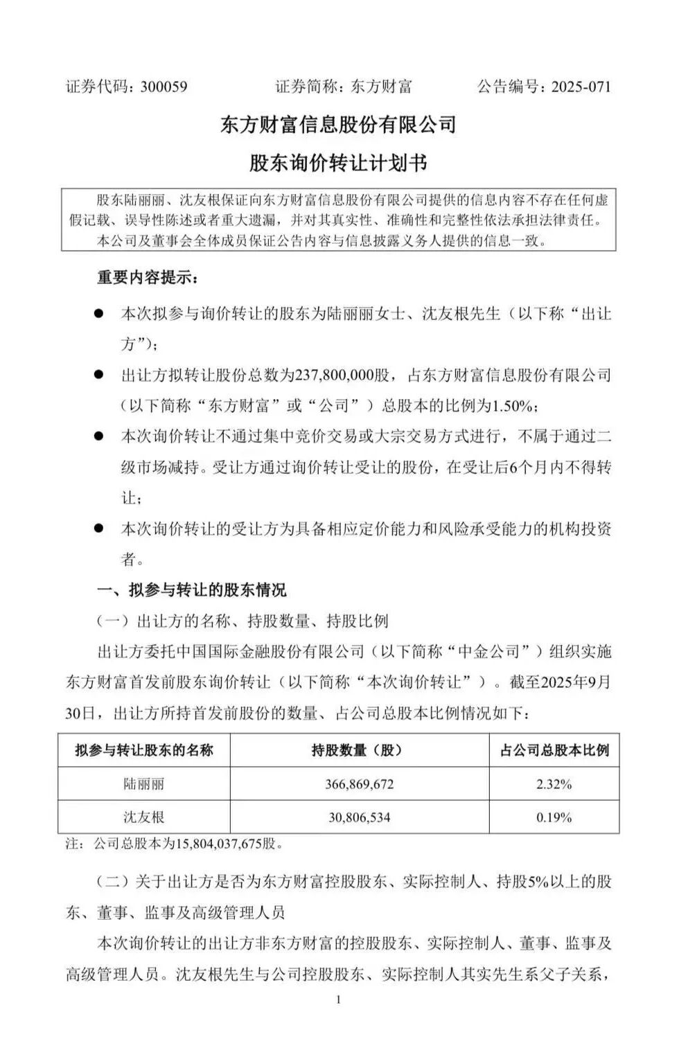 9月30日晚,东方财富发布《股东询价转让计划书》。公告称,股东陆丽丽、沈友根计划通过询价转让方式转让股份23780万股,占公司总股本的比例为1.50%。转让原因为个人资金需求。本次询价转让不通过集中竞价交易或大宗交易方式进行,不属于通过二级市场减持。本次询价转让的受让方为具备相应定价能力和风险承受能力的机构投资者。受让方通过询价转让受让的股份,在受让后6个月内不得转让。