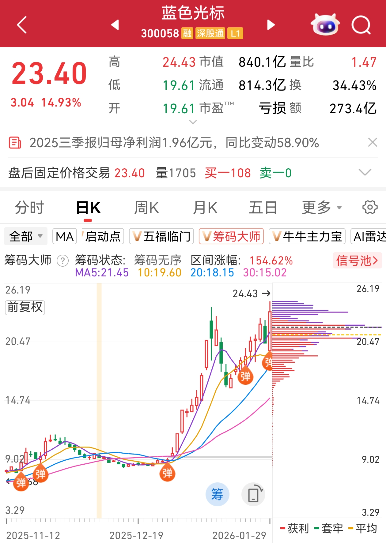 注:“筹码大师”显示,蓝色光标2026年1月22日、1月20日连续出现“弹”信号!