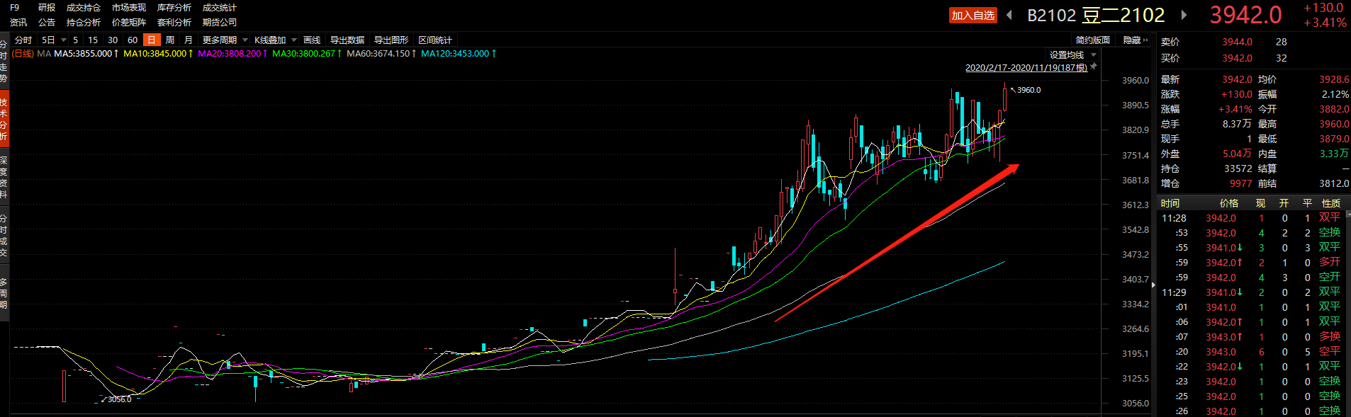 今日豆二期货2102主力合约再次飙涨,截止发稿以3.59%的涨幅领跑全场,纵观近期的走势也是在一路上扬。