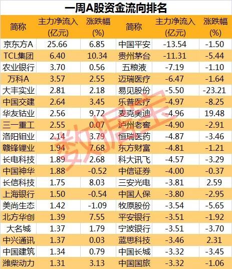 个股方面,本周共25股主力资金净流入超亿元。京东方A主力资金净流入25.66亿元,主力资金流入力度最大,该股本周上涨6.85%。TCL集团获主力资金净流入也有6.4亿元,本周上涨10.34%。这两家公司都是生产面板的行业头部公司,获主力资金净流入的面板企业还有深天马A,净流入0.85亿元。