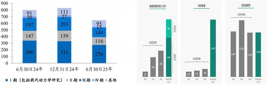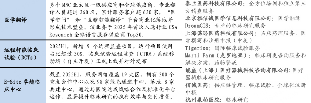 丰富的项目经验、广泛的医院合作基础、全面的业务平台加深公司护城河。截至2025H1公司在执行药物临床试验项目646个,已于中国超过1100家临床试验机构合作,可提供药物全生命周期临床一站式解决方案。公司SMO业务拥有一支超过3000人的专业团队,其中临床协调员2700人,累计项目经验3500余个,覆盖中国超过150个城市,合作中心超1100家。公司凭借多年的项目经验、医院合作基础,以及业务间的关联性,有望强化平台化龙头优势,获得更多项目与份额。