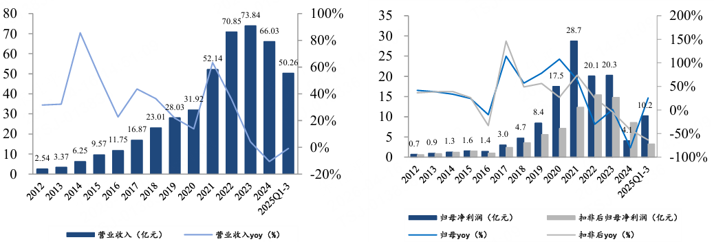 2025Q1-Q3公司营收为50.26亿元,同比下滑0.82%;归母净利润为10.2亿元,同比增长25.45%,扣非后归母净利润为3.26亿元,同比下降63.46%,利润端增速由负转正,营收端有回暖。主要系存量低价订单的逐步出清以及新签订单增长贡献。随着新签订单增长、存量低价订单消化,公司业绩有望自2026年明显修复。