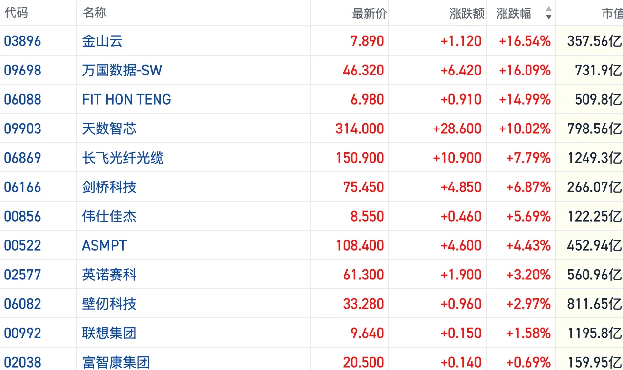 截至发稿,万国数据-SW(09698.HK)、金山云(03896.HK)双双涨超16%,天数智芯(09903.HK)等多只个股也跟涨逾10%。